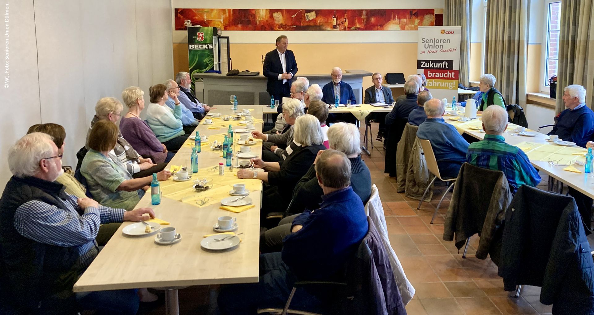 Am 16.03.2020 konnte der Vorsitzende Siegfried Albrink der CDU Senioren Union Dülmen mehr als 30 Mitglieder zum Dämmerschoppen im Kolpinghaus begrüßen. Dort berichtete Landtagsabgeordneter Dietmar Panske von seinen Aufgaben als Mitglied im Innenausschuss, Obmann im Untersuchungsausschuss und Bundeswehrbeauftragter der CDU: Im Innenausschuss sind sehr gute Erfolge beim Kampf gegen die Clankriminalität zu verzeichnen. „Die Kriminalstatistik ist so niedrig wie nie zuvor“, betonte Panske. Die Polizei sei mit Smartphones und neuen Sicherheitswesten ausgestattet worden. Außerdem würden jährlich ca. 3000 Polizeianwärter eingestellt. Dietmar Panske unterstrich, dass die Zahl der demnächst in Pension gehenden Beamten allerdings nicht ausreichend abzufangen sei, so dass immer noch Personal fehlen werde.