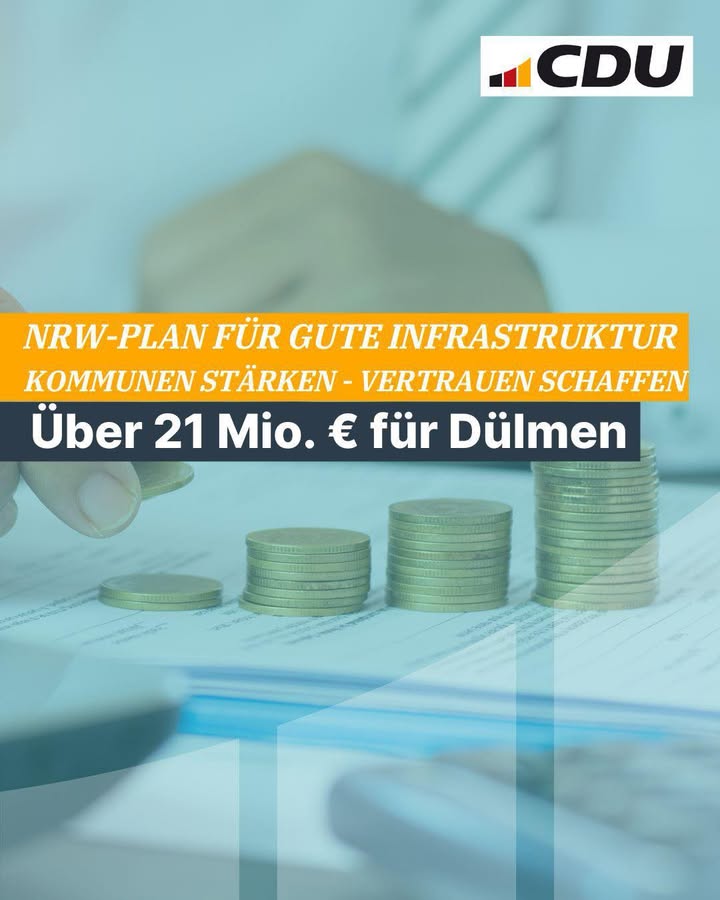mehr🚀 Nordrhein-Westfalen-Plan: Rekordinvestitionen für unsere Zukunft ? auch Dülmen profitiert! 💪Mit dem Nordrhein-Westfalen-Plan für gute Infrastruktur startet die Landesregierung das größte Investitionsprogramm in der Geschichte unseres Bundeslandes:👉 31,2 Milliarden Euro in den nächsten 12 Jahren ? davon 21,3 Milliarden Euro für die Kommunen!💶 Dülmen erhält insgesamt über 21 Millionen Euro aus dem Programm.Das Geld fließt direkt vor Ort in wichtige Projekte ? unbürokratisch und zielgenau.Die Schwerpunkte:🏫 5 Milliarden Euro für Kitas, Schulen & Ganztagsangebote🌱 2 Milliarden Euro für energetische Sanierungen & Klimaschutz🚴♂️ Außerdem: Investitionen in Straßen, Brücken, Radwege, Digitalisierung, Sport & Sicherheit🗣️ Wilhelm Korth (MdL) und Stadtverbandsvorsitzender Hendrik Clodius:"Das ist ein starkes Signal für unsere Region. Mit dem NRW-Plan investieren wir in Bildung, Klimaschutz und Infrastruktur ? und damit direkt in die Zukunft unserer Gemeinde!" 🌟Der Nordrhein-Westfalen-Plan steht für Verlässlichkeit, Fortschritt und Zukunftsperspektiven ? weil gute Infrastruktur das Fundament für ein starkes und lebenswertes Dülmen ist. ?#NRWPlan #CDU #ZukunftGestalten #Infrastruktur #Bildung #Klimaschutz #GemeinsamStark #HeimatGestalten