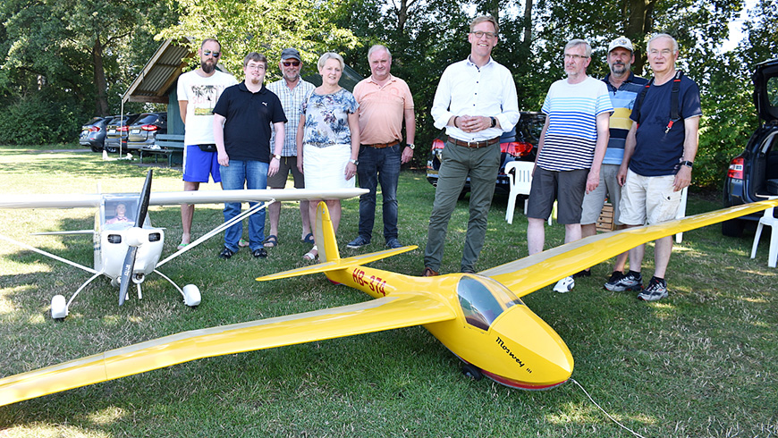 Auch um den Nachwuchs kümmert sich der Verein. Mit Christian Baron verfügt der Vorstand über einen Jugendwart, gemeinsam mit dem Annette-von-Droste-Hülshoff-Gymnasium wurde eine Modellbau-AG ins Leben gerufen. Während manches Vereinsmitglied noch mit der Laubsäge werkelt, kommen bei anderen sogar CNC-Fräsen zum Einsatz. „Aber egal aus welchem Material und mit welchem Werkzeug, abheben können alle Modelle“, betonte Ries. Nach einer kurzen Einführung griff Henrichmann selbst zum Steuerknüppel – im sogenannten „Lehrer-Schüler-Betrieb“. Gemeinsam mit Ries brachte er den Flieger sicher wieder auf den Boden.